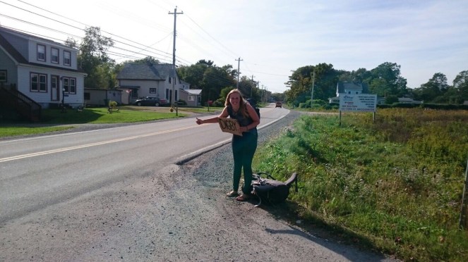 Uiteraard zijn er precies nul mogelijkheden om met het openbaar vervoer naar Digby te komen en Annika komt vanuit een heel andere richting, dus mij ophalen is ook geen goede optie. Mijn vrienden bij de doolhof stellen voor om te liften. Als het ergens kan, is het wel in het allervriendelijkste Nova Scotia en het is tenslotte maar 2 uur op een rechte weg. En het is gratis. Dus op dinsdagmiddag word ik op een strategisch punt langs de highway met m’n duim omhoog en m’n stuk karton met daarop “Digby” en een smilie, gedropt. Ik voel me welgeteld 7 minuten een idioot, voordat iemand in een racewagen voor me stopt. De man zit onder de tattoos en heeft extreme blingbling op zijn zonnebril en kettingen. Hij kan me 10km verderop droppen voor hij een afslag moet nemen. Oké, dan ben ik in ieder geval weer even opgeschoten. Bovendien is de auto écht heel erg cool. De man heet Mike en hij blijkt heel erg aardig en super geïnteresseerd in mijn reis te zijn. Ik vertel dat ik later deze week naar de VS ga. “O, ik zou willen dat ik daarheen kon!” zegt hij. “Maar dat kun je toch?” “Nee, nee, dat kan ik niet, want ik heb een strafblad”. Aha. MANMANMAN. Heb ik weer. Op de kruising word ik met mijn hele hebben en houwen afgezet en nog geen 5 minuten later zit ik bij een andere man in de auto. Ik kan zijn naam niet uitspreken, maar hij gaat naar Digby, deelt zijn chips met me en spreekt vrijwel alleen maar Québécois Frans, dus ik zet de muziek harder en zing de rest van de reis mee met alle liedjes die ik ken.