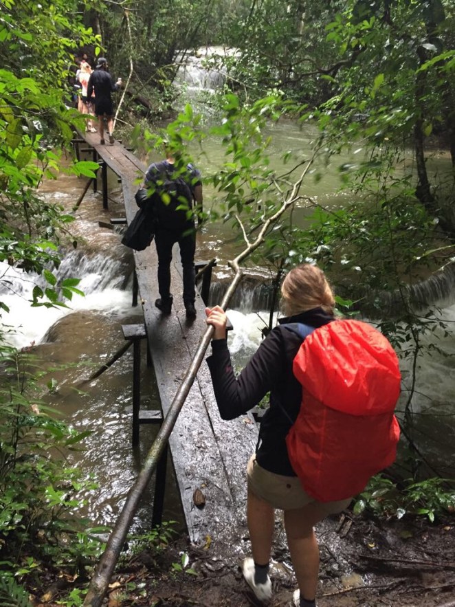 Een even simpel ritje terug in zo’n zelfde truck en we zijn weer in Palenque waar we de rest van de middag rondslenteren en het dorp bekijken. Onderweg had ik veel negatieve berichten gehoord over Palenque; dat er zo weinig te doen is, dat het lelijk is, saai. Ik vind het echter een hartstikke gezellig dorpje. Leuke restaurantjes, een veelvoud aan souvenirwinkeltjes en een markt. Morgen maak ik wel even een uitstapje: ik heb een hike door de jungle geboekt en deze duurt de hele dag. Yes! Kom maar op! Rochelle en ik nemen die avond al afscheid want ik moet om 5.30 uur in de lobby zijn. Jammer genoeg komt de regen met bakken uit de lucht en om 6.15 uur hoop ik half en half dat ze me vergeten zijn en dat ik terug naar bed mag. Maar ik word dan uiteindelijk toch opgehaald zonder verklaring waarom het zo lang duurde (lang leve Mexico). Ik stap in een busje en zie direct dat ik de enige ben. Vreemd. Een kwartier later stoppen we bij een tankstation en ik begrijp dat ik moet overstappen naar een ander busje. Hier zitten wel mensen in, onder wie een gezellig Deens koppel, en we rijden 2 uur lang richting de grens van Guatemala. Halverwege de rit wordt het me duidelijk dat ik de enige ben in het busje die de jungle tour gaat doen. De rest bezoekt een ruïne en een waterval en er is ook een man die naar Guatemala gaat. Sorry, wat? Waar ga ik precies heen? Op de ‘plaats van bestemming’, waarvan ik niet weet of dat ook daadwerkelijk mijn plaats van bestemming is, moeten we allemaal uitstappen en wordt iedereen een bepaalde kant op gewezen. Ik had me er al bij neergelegd dat ik met de rest meega op de tour die ik niet had geboekt, maar ik mag dan toch als enige van de groep een andere kant oplopen. Daar ontmoet ik 4 anderen en ons wordt verteld dat we in de personenauto die daar staat te wachten, mogen stappen. Met de chauffeur erbij zijn we dus met 6 en dat houdt in dat een koppel noodgedwongen bij elkaar op schoot kruipt. Alles wat tot nu toe is gebeurd, duidt erop dat ik absoluut wel vergeten was vanochtend en dat iedereen dat uit alle macht probeert te verbergen en doet alsof dat niet zo is. Ach, ik ben gelukkig wel flexibel inmiddels. Het regent nog steeds overigens. Niet hard, maar je wordt wel nat. Bah. Ik bekijk mijn Nikes die een natte badkamervloer al niet droog doorkomen en besluit voor de hike toch mijn witte, plastic H&M sneakers aan te doen. Precies nul grip, maar hopelijk wel wat waterdichter. Naast mijn paraplu, die al sinds mijn 3e week op reis mijn trouwe buddy is (hoewel afgekloven door een hond in Nova Scotia en half uit elkaar gewaaid in Chicago), heb ik niks bij me dat echt waterafstotend is. Uiteindelijk hul ik mezelf in de regenhoes van mijn backpack en dat zit nog minder lekker dan dat het eruit ziet. De groep bij wie ik uiteindelijk terecht ben gekomen, is het ook unaniem eens over een vuilniszakkostuum voor de hike. Lekker unisex. Zodra iedereen zijn vuilniszak op de juiste plekken open heeft geknipt en we 10 minuten de jungle inploegen, stopt het met regenen.