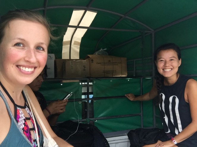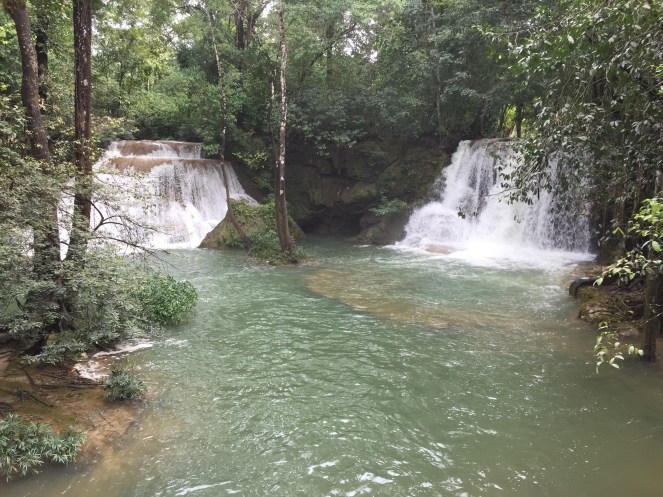 Palenque is een klein dorp niet ver van de jungle en hoewel het warm is, is het niet erg zonnig vandaag. Dat is nieuw! We gaan op zoek naar de waterval die Misol-Ha heet. Deze wordt ook bezocht door veel tourgroepen, maar wij gaan ‘m zelf proberen te vinden (= een stuk minder duur). De receptionist legt ons in half Spaans, half Engels uit waar de collectivo’s naar deze waterval zich bevinden en we lopen naar de aangewezen locatie. Daar aangekomen, blijkt het niet zo simpel als gedacht. Normaliter staat er op elke collectivo waar deze naartoe gaat of staat er in ieder geval wel een schreeuwerig mannetje naast die te pas en te onpas de bestemming in je oor brult. In dit geval toeteren louter collectivo’s naar ons die naar de ruïnes van Palenque willen brengen. No, gracias. Na een paar keer van het kastje naar de muur te zijn gestuurd door een aantal aardige, maar weinig behulpzame Mexicanen, stopt een taxi voor ons. De chauffeur heeft voor de verandering niet de intentie ons op te lichten en hij begrijpt direct dat we een collectivo zoeken, die doorgaans 5 keer zo goedkoop is als zijn transport-aanbod. Uiteindelijk mogen we gratis instappen bij hem en hij brengt ons naar de plek waar we werkelijk moeten zijn (uiteraard daar waar we waren begonnen). Vervolgens houdt hij een auto aan met een hoge laadbak waar achterin ook plek is om te zitten. Dit zijn geen collectivo’s, maar particulieren die goederen van A naar B brengen en als ze genoeg plek hebben, ook mensen meenemen voor dezelfde prijs als de collectivo’s. Rochelle en ik springen achterin en aangezien de laadbak geen achterkant heeft, moeten we goed vasthouden zodra de auto wegscheurt. Het is een prachtige tocht en een halfuur later worden we netjes bij de beloofde waterval afgezet. Misol-Ha is schitterend en we worden zeiknat als we achter het water langslopen. Natuurlijk ontmoet ik daar, tussen alle rotspartijen en het groen een vrouw met wie ik een paar weken geleden op de steiger in Bacalar heb gelegen. Toeval bestaat niet, zeggen ze. Nouuu…