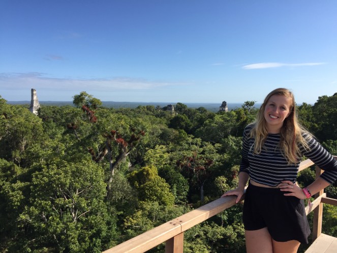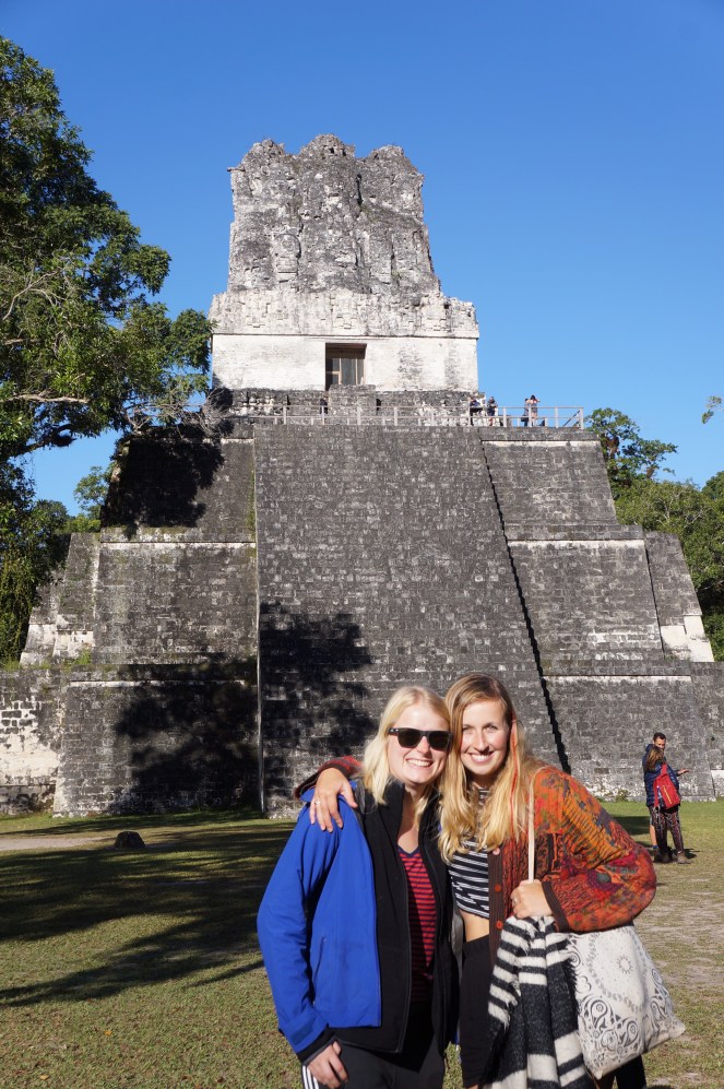 Er is nog een reden waarom ik vandaag al naar Flores ga: KATY EN CASPAR ZIJN DAAR! Ze reizen samen 3 weken door Guatemala en het komt toevallig zo uit dat we elkaar in Flores kunnen treffen. Superleuk! Ik kijk er zo naar uit om een écht bekend gezicht te zien (sorry, Omar) en zodra ze samen mijn hostel binnenlopen, voelt het direct weer alsof we elkaar elke week zien. Eigenlijk zoals het altijd tussen Katy en mij gaat: je ziet elkaar soms maanden niet, maar er is niks veranderd <3. We praten heerlijk bij onder het genot van een biertje voor haar en Cas en een watertje voor mij. Alles rommelt en knort en borrelt nog dus ik houd me voorlopig even koest wat betreft eten en drinken. 2 dagen later onderneem ik pas weer iets: ik ga naar de -voorlopig- laatste Maya-ruïne op mijn lijst: Tikal. Ik ga mee op een supervroege tour waardoor we als een van de eersten in het park zijn en het is fantastisch! Vergeleken met Chichén Itza en Palenque, is dit absoluut mijn favoriet. De ruïnes zijn gigantisch en worden omringd door prachtige jungle. Een heel groot deel van alle bouwwerken wordt zelfs nog overdekt met bomen en groen en kun je maar net aan onderscheiden van een normale heuvel. Ook horen we overal de zogenaamde howler-apen. Wow. Het geluid dat zij produceren is zowel indrukwekkend als angstaanjagend. Je denkt minstens dat er een bende gorilla’s op je af komt stormen, terwijl de apen in kwestie niet zó groot zijn en zich vooral schuilhouden in de bomen. Wel heel cool. Ook vind de gids het nodig met een stokje in een hol te prikken, waardoor de achtpotige bewoner zichzelf even bovengronds meldt. Ggg, tarantula’s. Maar ik vind het dan stiekem toch zielig dat ‘ie wordt geprikt. Dan heb ik toch echt een keer te doen met een spin.