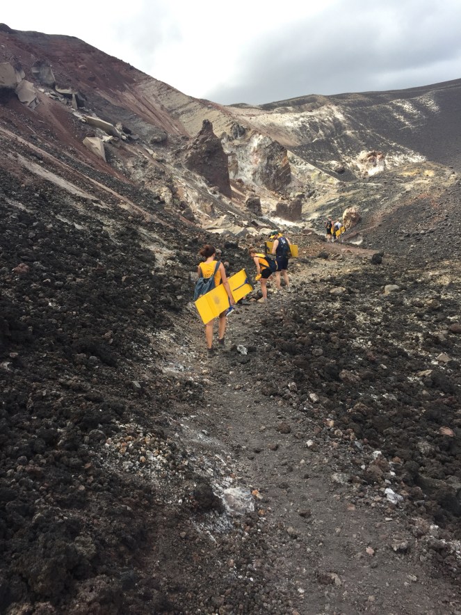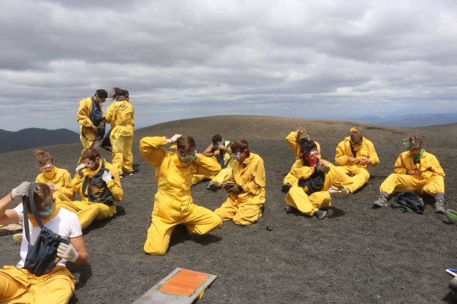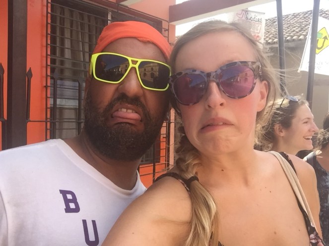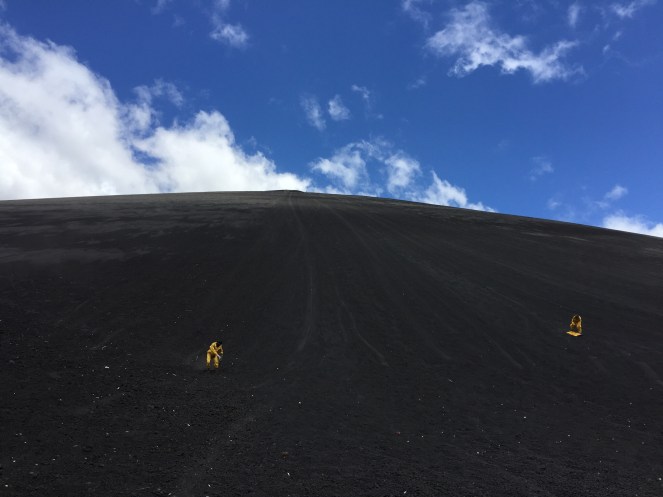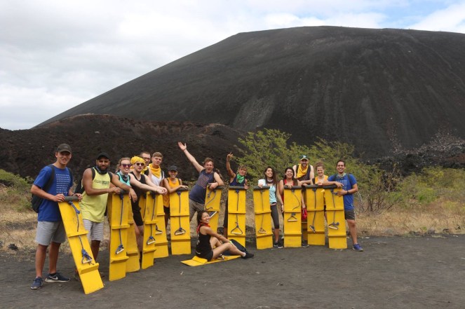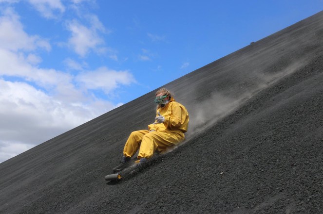 Oké, tijd voor actie. Als je in León, Nicaragua bent, is er 1 ding dat je écht moet doen: Volcano Boarding! De Cerro Negro is een grote, zwarte, actieve vulkaan waarvan in 2002 een idioot op een mountainbike naar beneden is gecrosst en daarbij zo’n beetje alle botten in zijn lichaam heeft gebroken. Dit leidde echter wel tot de ontdekking van deze vulkaan en zijn potentie en vanaf 2004 worden er tours georganiseerd waarbij men naar boven hiket en naar beneden gaat op een board, wat eigenlijk een soort sleeën is. Bij het aanzicht van de vulkaan, krijg ik het in eerste instantie Spaans (toepasselijk) benauwd: moeten we van zó hoog naar beneden glijden op een plank?! Gelukkig staan er wat locals beneden die voor USD 5 aanbieden je board omhoog te dragen. Daar hoef ik geen seconde over na te denken, want ik krijg enigszins Acatenango flashbacks. De hike is echter maar een uur en heel relaxed. We lopen door een bizarre omgeving bestaande uit vulkanische stenen in diverse kleuren. Het lijkt wel een maanlandschap. Heel erg gaaf! Op bepaalde plekken komt er rook uit de grond en de gids grapt dat hij hoopt dat de vulkaan vandaag niet zal uitbarsten. Grappig. Bovenop de vulkaan worden we bijna omver geblazen door de harde wind en we moeten onze sexy, gele overalls al zittend aantrekken. Sokken over de broekspijpen, sjaal voor je mond en een grote, plastic bril op je neus en je bent klaar voor de rit. Ik voel m’n hart kloppen in m’n keel. Van bovenaf ziet er helemaal steil uit en gemiddeld gaat men met zo’n 50 km p/u naar beneden. Ik zie mezelf natuurlijk al 10 keer over de kop vliegen en vraag me af waarom ik dit ook alweer doe: een redelijk terugkerend thema tijdens deze reis. Maar zoals met vrijwel alles waarover ik dat denk: het waarom wordt direct beantwoord tijdens, of in ieder geval na de rit. Wat gaaaaf! Ik ga waarschijnlijk zo langzaam als maar kan, maar wát een ervaring! Hoewel ik mijn ogen voornamelijk angstvallig op mijn board en voeten houd, kan ik toch genieten van het spectaculaire uitzicht. Op een gegeven moment zie ik de gele poppetjes die voor mij naar beneden zijn gesuisd weer opdoemen in het zwart van het vulkanische as en ik besef dat het alweer bijna voorbij is. Ik feliciteer mezelf met mijn leven en geniet daarna van de mensen die volgen. De een gaat net als ik in een beheerst tempo, de ander als een soort ongeleid projectiel in een waas van blinde paniek en adrenaline. Fan-tas-tisch!