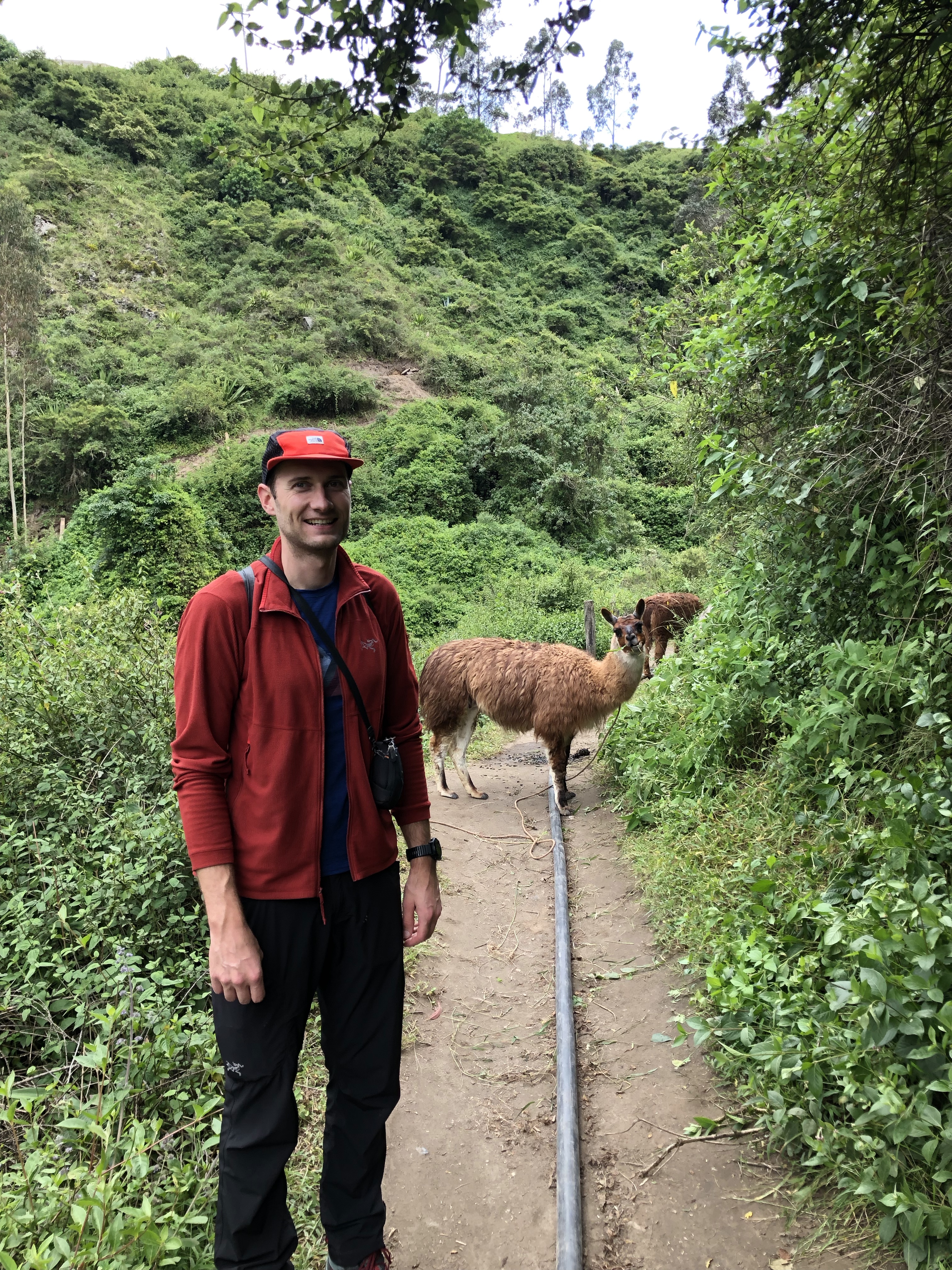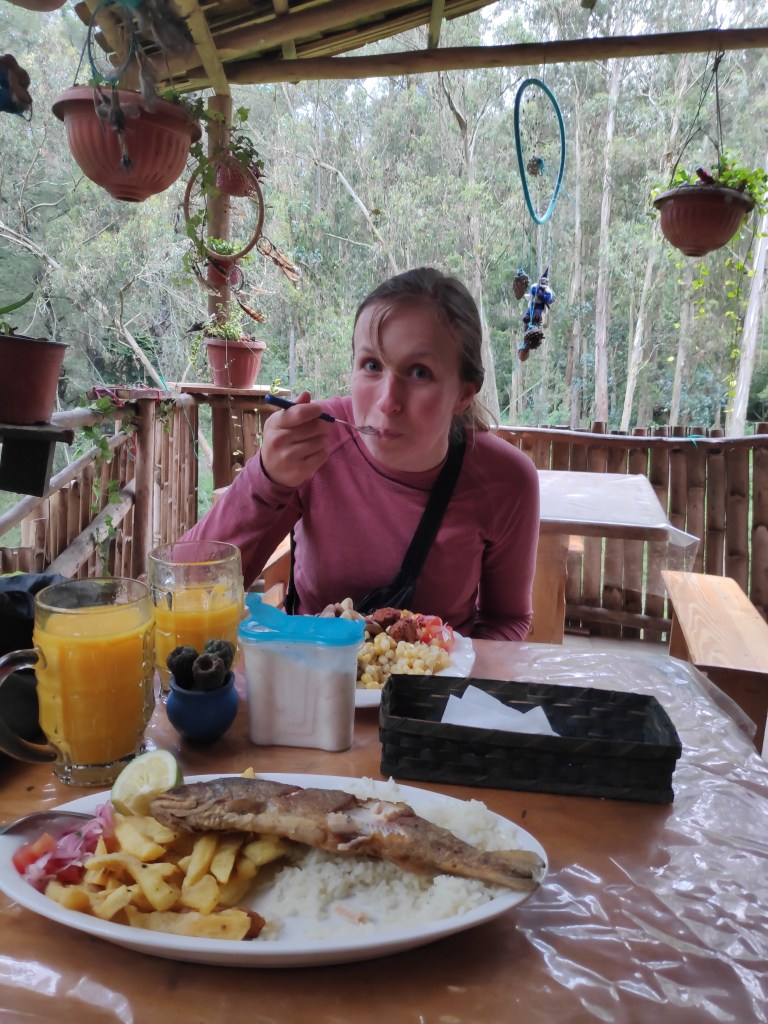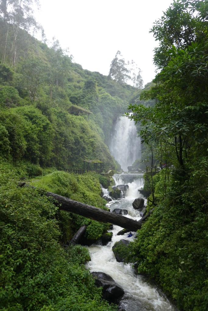 De eerste nacht staan we voor 2 hele dollars in een soort nationaal park / reservaat waar een groot deel van de inheemse bevolking graag komt. Ondanks het feit dat we er kamperen, moeten we alsnog bij het toiletgebouw betalen. 15 cent zonder wc papier, 20 met. En ‘s nachts gaat het toiletgebouw dicht. Ik vraag enigszins voor de grap wat we dan moeten doen, als we zeg maar… moeten. Ze kijkt me lang en schaapachtig aan zonder iets te zeggen en ik trek daar de nodige conclusies uit. Het is wel echt schitterend hier! Erg idyllisch. Op onze wandeling naar de waterval komen we niet alleen twee nietsvermoedende lama’s tegen, maar belanden we ook bijna in een soort cleansing ritueel in een grot. Twee mannen met lange zwarte paardenstaarten vragen Jona of hij limpia is en zo niet, of hij dan gereinigd wil worden. Ik had dit dus heel graag willen zien, maar het voelde toch een beetje alsof we iets bijzonders zouden verstoren, dat we toch niet helemaal serieus zouden nemen. Dus zijn we maar gaan eten in het inheemse restaurant. We krijgen geen mes en Jona moet zijn vis zien te ontgraten met alleen een vork. Mijn hele bord ligt vol met van alles en het smaakt allemaal precies nergens naar. De waterige ketchup die we erbij krijgen, maakt het zo mogelijk nog minder smaakvol. Maar goed, we zijn weer een ervaring rijker en hebben de lokale bevolking gesponsord.