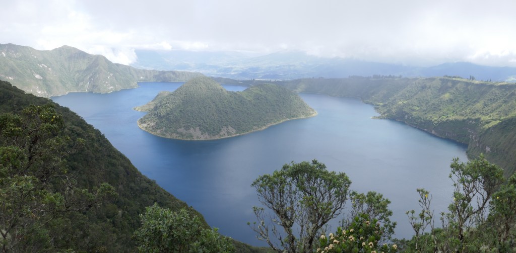 Ondanks de misère presteren we het om even een rondje over de markt te doen. Helaas niet op de zaterdag, want dat was het hoogtepunt van het dieptepunt op het gebied van lichamelijke vloeistoffen. Maar toch even geweest! En de dag erna lijkt het tij helemaal gekeerd en gaan we vol optimisme richting Laguna Cuicocha, een kratermeer waar je in 12 km een mooie hike omheen kunt maken. Er gaat niet echt een bus direct naartoe en terwijl we proberen uit te zoeken hoe we er gaan komen, worden we natuurlijk ongevraagd geholpen door heel Otavalo. Dat resulteert in een ritje achterin iemands truck, waarvan we dan maar hopen dat hij weet waar we heen willen. Dat weet hij gelukkig en uiteindelijk moeten we aan hem hetzelfde bedrag betalen als we aan een normale taxi waren kwijt geweest. Maar goed, we zijn er! Mijn filosofie van vandaag is: als je niet veel eet, kan er ook niet veel uitkomen, en dat blijkt waar te zijn. De hike begint met omhoog lopen en confronteert ons met onze zwakte en ellende van de afgelopen dagen, maar naarmate de dag vordert, voel ik me topfit. Het meer is mooi, het gezelschap is leuk en zodra we klaar zijn met het rondje, regelen we een lift met een duur uitziende metroman en zijn in bont gehulde vrouw. Met nog een andere vrouw naast ons in de auto zou je kunnen stellen dat het vol is, maar halverwege komt er nog een man + kleuter bij op de achterbank. Dat kan gewoon!