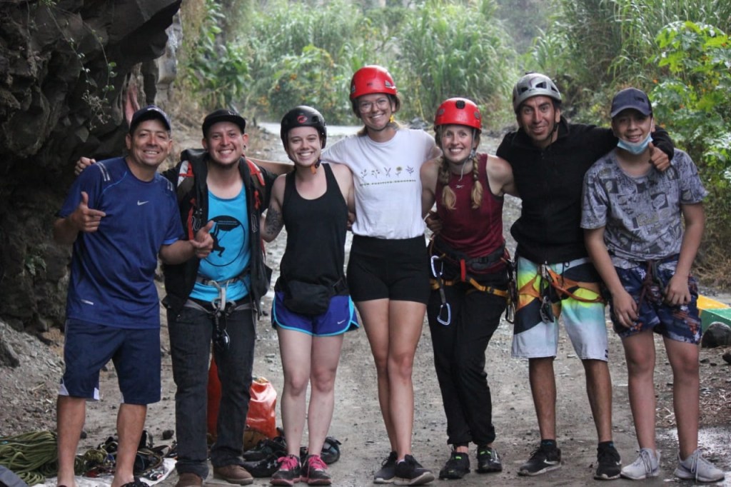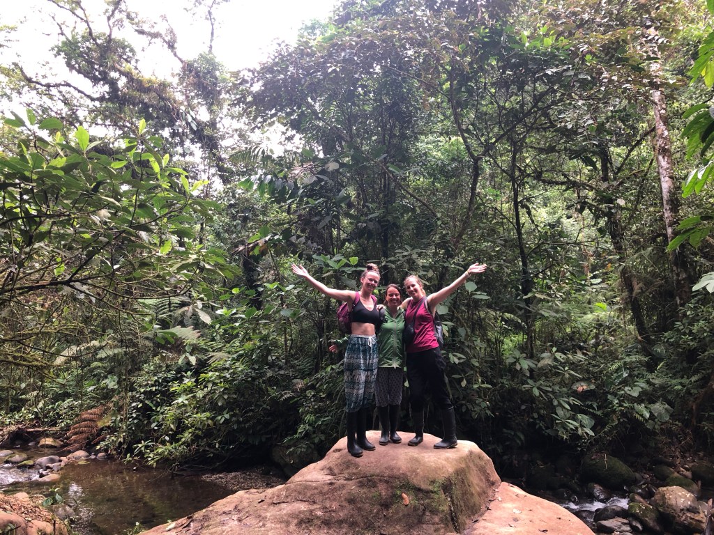 In de tussentijd heeft Jona de summit van Cotopaxi gehaald (trots!) en sluit hij zich bij me aan in Baños met de mededeling dat hij ook Chimborazo gaat beklimmen volgende week. Dat moet hij zeker lekker doen! Nogmaals: ik vermaak me wel, maar ik vind het ook wel erg gezellig dat hij af en toe een paar dagen bij me langskomt. Dus gaan we lekker crêpes eten, een dagje mountainbiken naar de mega waterval hier in de buurt en chillen op de Erupcion rooftop in het zonnetje. Cocktails! Met twee Canadese meiden ga ik ook nog een dagje rotsklimmen (zonder Jona zelfs!) en een andere dag op jungle-tour. We gaan tenslotte niet diep de Amazone in op onze reis (want beesten en heet en geen zin) maar een dag is toch wel leuk. Onze gids heeft duidelijk geen zin in de tour en nog minder zin om Engels te praten. Wij zijn de enigen van het gezelschap die niet Spaanstalig zijn en wanneer hij iets uitlegt, praat hij zo’n 30 uur Spaans en krijgen wij een halve vertaling in 2 minuten. Verder flirt hij er flink op los met een Italiaanse die zijn chagrijnige bakkes nog leuk lijkt te vinden ook. Maar hey, de 6 Chilenen die mee zijn schatten mij in als 23 jarige, dus ik heb een prima dag! We bezoeken een uitzichtpunt over de rivier, een inheemse familie waarbij we absoluut niet Coronaproef sterke alcohol en kokosprut moeten drinken uit een gezamenlijk kommetje, we gaan met een kano over de Amazone rivier en maken een hike naar de waterval waar je kunt zwemmen. In alle hectiek (cocktail pitchers gisteren) ben ik totaal vergeten om m’n bikini aan te doen, dus geen zwemmen voor mij. Op zich niet erg, want er liggen al zoveel bleke toeristen in hun onderbroek in het kleine meertje, dat ik er nauwelijks bij had gepast. Daarna bezoeken we nog een chocoladefabriek, waarbij we hetzelfde verhaal krijgen als in Mindo, dus wij wachten geduldig op de proeverij. In plaats van chocola krijgen we echter een soort aardappelpannenkoek en chocolademelk en daarna mogen we weer terug in de bus naar Baños. Oké! Niet de beste tour maar al met al wel heel veel gedaan in één dag. En de bevestiging voor mij dat 1 dag in de jungle meer dan genoeg is. Geen beest gezien overigens.