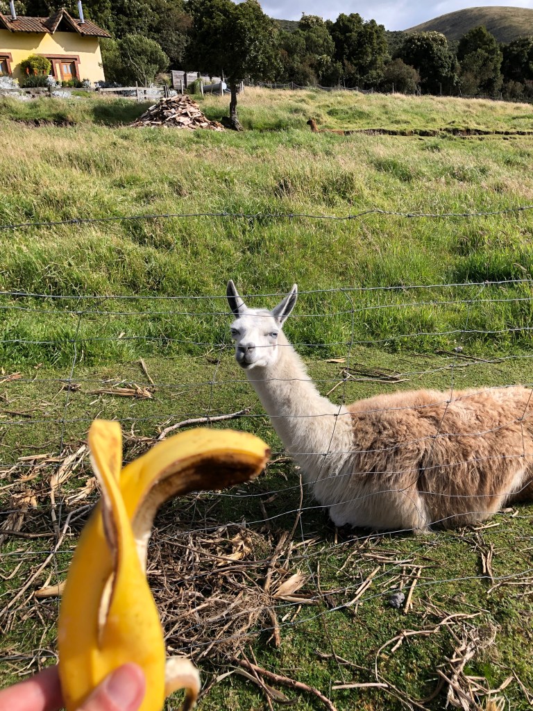 Hoppaaa, op naar Cotopaxi National Park! Na een rustig nachtje in de hoofdstad van Ecuador te hebben doorgebracht, nemen we om 10 uur ‘s ochtends de shuttle naar ons onderkomen voor de komende 2 nachten. Het is altijd een goed teken als je meer dan een halfuur over een onverharde weg moet rijden (hobbelen met hoofdstoot tegen het dak): dan kom je op de écht mooie plekken. En wauwww, daar is The Secret Garden hostel in Cotopaxi er zeker één van. Het is gelegen aan de voet van de Pasochoa vulkaan en kijkt uit op drie andere vulkanen, met de Cotopaxi als ultieme eindbaas. Het hostel heeft ervoor gezorgd dat alle kamers of verblijven te alle tijden uitzicht blijven houden op deze vergezichten: vanaf de eettafel, vanaf de wc, vanuit de douche en vanuit de jacuzzi (!). Jona zat eerder nog te twijfelen of hij de Cotopaxi wilde gaan beklimmen, maar ik had die twee al eens eerder met elkaar zien flirten toen Cotopaxi even haar gezicht liet zien toen we met de bus er langs reden. Ik ken Jona langer dan vandaag. En zodra we voet zetten in dit hostel en Steven, de tourgids/planner/manusvanalles, aangeeft wat er allemaal mogelijk is hier, zie ik Jona’s ogen glinsteren van blijdschap. Hij draait zich naar mij toe en zegt direct: ‘zullen we nog een nacht boeken?’ Ergens hoopte ik dat al, want hoewel ik zeker niet dezelfde piekdrift ervaar als hij, is er voor mij ook genoeg te doen hier! En het is zo ontzettend mooi en rustgevend, en een soort all inclusive zomerkamp: we hebben een gezellige slaapzaal, als de bel gaat gaan we met z’n allen aan tafel en wordt ons eten geserveerd (we hebben hier zelfs de Ecuadoraanse delicatesse geprobeerd: cavia!) , als je in de jacuzzi wilt, kun je die reserveren en, mijn favoriete deel, je kunt naar het veldje naast het hostel lopen om de lama’s (!) bananenschillen te voeren! En dit alles met uitzicht op moeder Cotopaxi. Wat een plek!