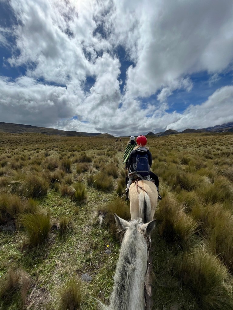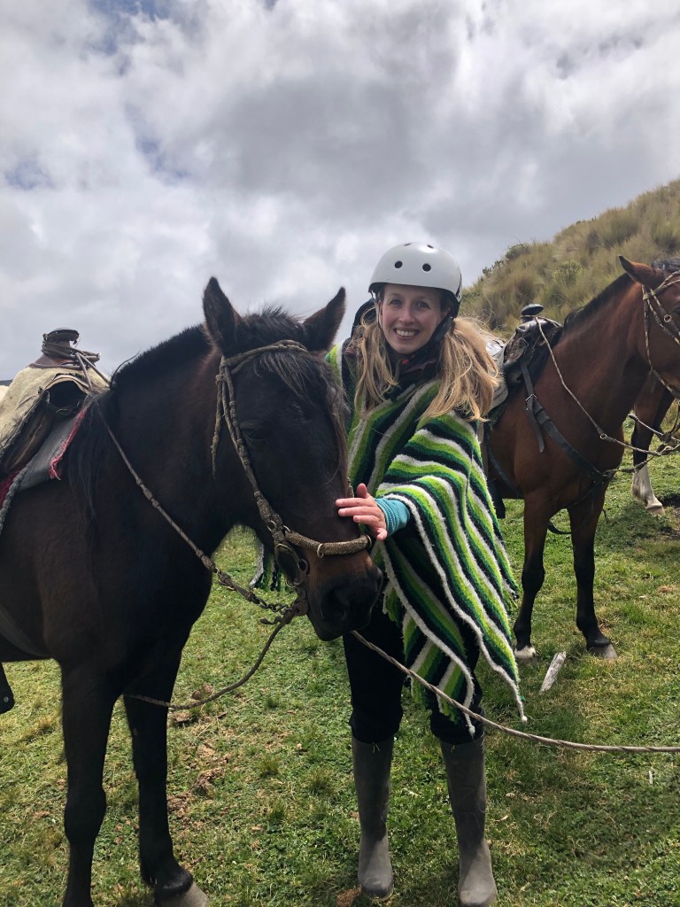 En dat is dan alleen nog maar de locatie zelf, waar we al snel een kleine familie vormen met de andere gelukzoekers. Elke dag is er van alles te ondernemen en de eerste middag gaan we op een waterval hike, waarbij we rubberlaarzen aan krijgen omdat we letterlijk door de rivier en de waterval hiken. Jona’s ene laars is helaas niet waterdicht, dus die geniet extra van de elementen. Verder gaat hij op een dag een wat technischere berg beklimmen met de Duitse Eduard en ga ik met m’n Poncho Posse (we hebben allemaal een poncho van het hostel gejat — uhh geleend) paardrijden in het nationale park. Jammer genoeg mogen we de poncho niet meenemen naar het paardrijden, maar je kunt er daar één huren voor 3 dollar. Jona is er niet om commentaar te leveren op de 3 dollar, dus 100% dat ik die poncho wil! Mijn paard is een chocoladebruin exemplaar en luistert (waarschijnlijk niet) naar de naam Capuli. Het is echt een prachtige dag en supermooi om hier te rijden! Cotopaxi speelt verstoppertje achter een wolk, maar komt af en toe even gedag zeggen. Ik leer dat Capuli erg enthousiast is, niet ervan houdt door beekjes te lopen (maar er liever overheen springt…) en dat hij óf alleen wil lopen óf met z’n neus in de kont van degene voor me. Niks ertussen in. Wat jij wilt joh. Op een langer stuk mooie heide beginnen de paarden enthousiast aan een galop, waar de meeste van ons ruiters absoluut niet op voorbereid was. Ik heb in het verleden alleen maar op luie paarden gezeten die het hele eind in een hardnekkige draf bleven hangen, dus zodra Capuli de galop inzet, schiet ik direct met m’n voet uit m’n beugel. AAAAAAAH! HELP! Capuli en ik herpakken ons en proberen het nog een keer of vijf, maar elke keer trek ik toch maar aan de teugels. Dat paard zal wel denken: wat zit er vandaag weer voor saaie doos op me… Maar ja, ik wil vooral gewoon niet dood, dus je hebt even pech, vriend. Maar wat een vette dag! Zo gezellig met de groep en gegarandeerde spierpijn voor de rest van de week! Heerlijk!