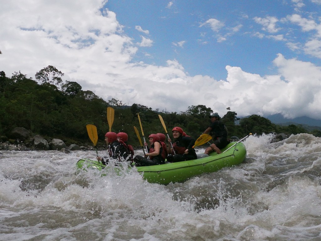 En nu Baños! Zoveel te doen! Met een hele groep meiden gaan we de eerste avond naar de hot springs en de dag erna ga ik voor het eerst raften! Supervet!!! Bij de uitleg van gids Dario zien we allemaal erg bleek en schijt ik persoonlijk zeven kleuren. De rapids zijn namelijk van level 4 en dat schijnt nogal heftig te zijn. Forward, backward, stop, inside… waarom doe ik dit ook alweer? Maar zodra de boot in het water ligt is het gewoon de dood of de gladiolen. Gas en gala. Ik denk dat we alle zes dusdanig graag niet willen sterven, dat we peddelen voor ons leven. En dat werpt z’n vruchten af! Wat is het gaaf! Zoveel adrenaline! Ik heb geen moment gehoopt dat het al voorbij zou zijn! En we zijn niet omgeslagen! HOERA!