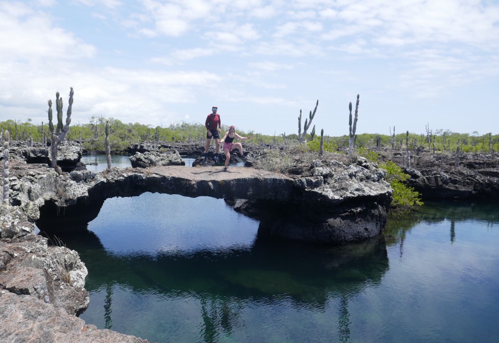 De Los Tuneles tour staat te boek als de populairste tour van Isabela en hadden we eerder gezien voor $105-145. Bij de eerste agency die we erom vragen, geven ze $85 pp aan. Oké, deal! Niks meer aan doen! Het is nog even de vraag of die lage prijs verband houdt met het feit dat niemand bij de haven ons op de lijst heeft staan voor de tour, maar gelukkig komt daar een kwartier later dan toch tourgids Glenda. Met haar beleven we een prachtige dag naar Los Tuneles, een vulkanisch tunnelsysteem met prachtige bruggen over helderblauw-groen water, waar we gaan snorkelen. Hiervoor moeten we een stuk met de boot langs de kust van Isabela varen en alleen deze bootrit is al ontzettend bijzonder! Nadat we de eerste hebben gezien, zien we er alleen nog maar meer, stiekem met een vin boven het water zwemmend, of zelfs er helemaal uitspringen: Manta’s (check!)! Zo cooool! Als een soort gigantische tapijten (bijna zo groot als onze huiskamer) zweven ze net onder het wateroppervlak. De kapitein stuurt er kundig op af en we hebben echt een bizar zicht op deze enorme wezens. Verwend als we zijn, hopen we half en half dat we ook een orka zien (een groep uit ons hostel liet ons gisteren jaloersmakende beelden zien van maar liefst 3 orka’s die rond de boot cirkelden! Holy shit!). Dat is ons niet gegund helaas, maar Los Tuneles maakt het meer dan goed! Houd je bingokaart maar bij de hand! Zeeschildpadden, en veel ook! White tip sharks! Zeepaardje! Octopussen! Blue Footed Boobies! Waaaa! Als een soort kind in de snoepwinkel zwemmen we door deze prachtige gesteentes heen. Glenda is ontzettend gezellig en geniet alsof ze niet elke dag hetzelfde rondje snorkelt. Heerlijk genieten!