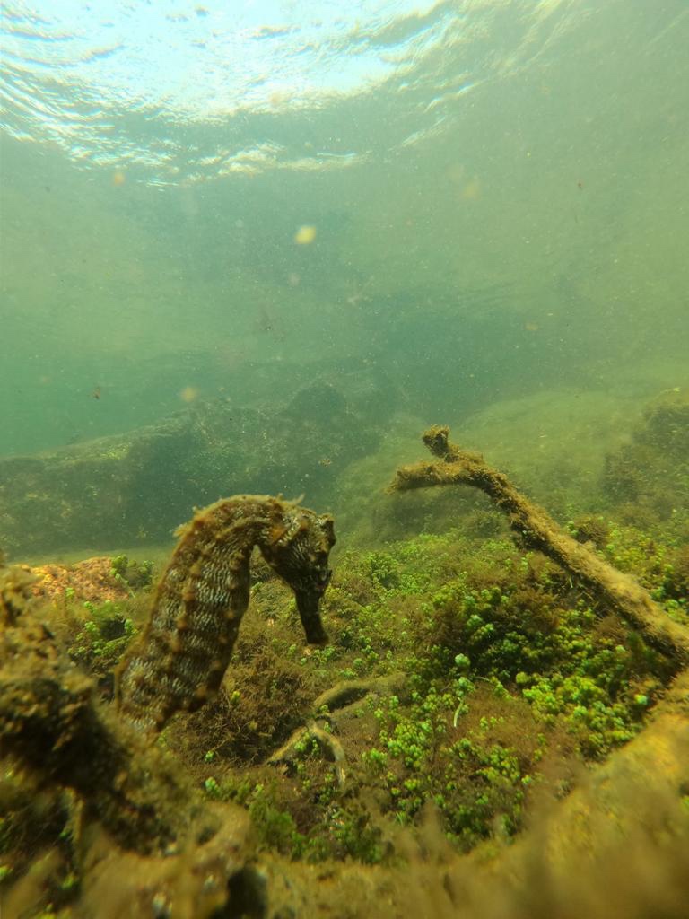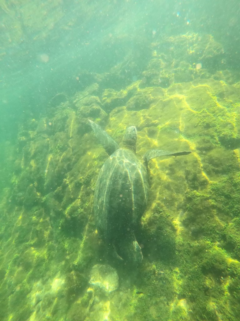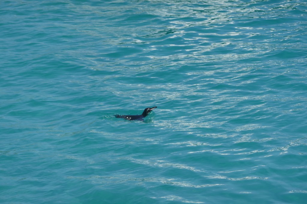 De kayak- en snorkeltour is echt ontzettend leuk! Toegegeven, het begint weer een beetje vreemd, waarbij wij op het strand om ons heen staan te gluren of iemand ons komt halen. De groep naast ons is overduidelijk niet de onze, maar we weten ook niet waar onze tourgids, Andrea, dan rondhangt. Ik besluit het te vragen aan de andere gids en hij wijst naar de vrouw recht achter ons op het bankje. Zit daar gewoon een beetje te chillen (misschien te hopen dat we niet op komen dagen?) met haar vriend. Andrea lijkt er weinig zin in te hebben, maar we zijn er dus ze heeft geen keus. Ook zijn we de enigen, dus privétour! Na een stroef begin breken we toch het ijs met haar en hebben we een onwijs leuke tour, waarbij we zelfs een stel pinguïns op een rots zien! Ze maakt foto’s met haar telefoon en belooft ze te sturen (heeft ze nooit gedaan en dat is echt heel stom). Maar we zagen wel pinguïns (check!)! Het water is verder vrij ruig en we zwemmen veel meer op open water dan bij Los Tuneles: echt weer een heel andere ervaring! Maar de zeeschildpadden, haaien en roggen zijn weer evengoed van de partij! Superleuke tour dus uiteindelijk, behalve dat we heel graag onze pinguinfoto hadden willen hebben, want dat was toch wel heel leuk geweest!