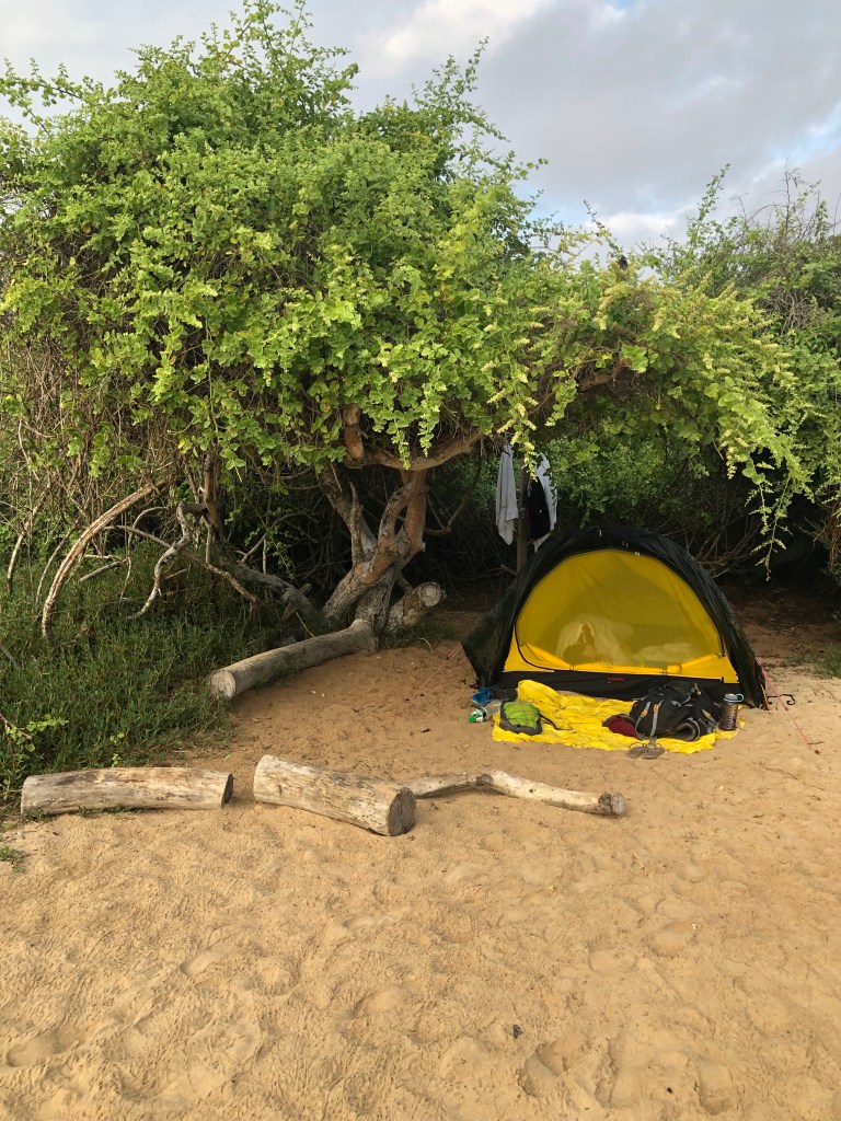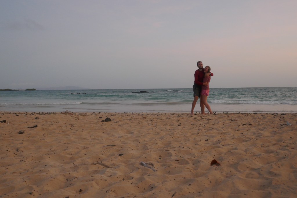 Op dag 2 gaan we naar Tortuga Bay. Geen schildpad gezien, want als er Tortuga in de naam zit, vind je er om één andere reden nooit schildpadden (ook niet in Casa de Tortuga in Mexico of op Tortuga Island bij Isabela). Onwijs logisch. Anyway… waaaaauw! Playa Brava en Tortuga Bay zijn wel echt de definitie van het paradijs: kilometers witte stranden, helderblauwe oceaan, leguanen overal en zelfs babyhaaien (check!) in de het kleinere poeltje. Zo ontzettend mooi! Echt idyllisch. Jona heeft ongeveer 200 foto’s gemaakt van de babyhaaien waar je gewoon mee kon snorkelen! Super bijzonder! Diezelfde dag hebben we nog een avontuur op de planning: we gaan namelijk kamperen! Aan de andere kant van Santa Cruz vind je Playa El Garrapatero: weer een heel ander soort idyllisch en tevens de enige plek op Galapagos waar je mag kamperen. Het heeft nog wel wat voeten in de aarde, want om überhaupt daar te mogen zijn na 17.00 uur moet je een permit hebben. Hier zijn we op onze eerste dag gelijk naar op zoek gegaan bij de kantoren van het Nationaal Park. Na zo’n 5 keer naar een ander kantoor gestuurd te zijn, hebben we haar eindelijk gevonden: Alexandra, de persoon die ons aan zo’n permit zou kunnen helpen. In een flink geairconditioned hok met alle luxaflex gesloten, treffen we haar en nog 4 andere Park Rangers aan. Ze zitten gezellig te ouwehoeren terwijl Alexandra onze gegevens bekijkt en onze achternamen probeert uit te spreken. Nerveus staan we tussen de 5 zittende mensen die ons allemaal geïnteresseerd bekijken en in rap en onverstaanbaar Spaans met elkaar doorkletsen. Er wordt even uitgebreid gelachen om het feit dat ik vier voornamen heb, maar uiteindelijk krijgen we dan toch onze permit. We moeten wel $20 aftikken hiervoor, maar dat is oké. Alexandra wijst ons er ook op dat we alleen bij Garrapatero kunnen komen met een taxi. En dus ook weer terug. Dat belooft niet veel goeds voor het budget, maar ja. Je moet er iets voor overhebben om te kamperen op een bijzondere plek. En bijzonder is het zeker! Hoewel de zon achter ons in land ondergaat, heeft de lucht prachtige kleuren gekregen en de hele avond worden we getrakteerd op het schouwspel dat ik ‘Het Diner van de Pelikaan’ noem. Eén voor één duiken 6 pelikanen de oceaan in op zoek naar hun volgende gang. Terwijl Jona opnieuw te veel foto’s maakt, eet ik chips op een boomstam. Er wordt druk bij me gebedeld door niemand minder dan de vinken van Darwin (check!). De kleine vogeltjes zitten nog net niet op mijn schoot en durven prima onder mijn benen de gevallen kruimels weg te pikken. Wel gezellig hoor! Ook komen de heremietkreeften (check!) ineens tevoorschijn uit hun holletjes – moeten nog uitkijken dat we er niet op gaan staan! Zodra de zon onder is, zien we andere dieren. Deze staan zeker niet op mijn bingokaart: muggen. EN VEEL OOK. Een enorme zwerm heeft zich verzameld voor onze tent en we moeten er head-first ons bed induiken. Wat volgt is zandvoeten in de tent én alsnog een stuk of 100 muggen die we ter plekke moeten afmaken. Wat een slagveld. Gelukkig hebben we het gezellig met elkaar, want het kamperen is wel een piepklein beetje afzien hahaha. Zand vermengt zich met zweet en zout en zorgt voor een plakkerig geheel, een stiekeme overlevende van de Muggen Massacre prikt ons lek en we liggen zoals gewoonlijk niet waterpas. Om een uur of 10 ‘s avonds (middenin de nacht als je al om 19.00 uur je tent in bent gejaagd) wordt er ineens met een zaklamp naar binnen geschenen. Twee grote meneren willen onze permit zien, ook al hebben we die eerder ook al moeten laten zien. Helemaal verwilderd geef ik het briefje aan, waarbij een aantal nieuwe muggen hun kans schoon ziet onze tent binnen te komen. Top. De Park Ranger lacht een beetje, geeft ons het briefje terug en wenst ons een goede nacht. Ja bedankt, vriend, als je maar niet nog een keer langs komt.
