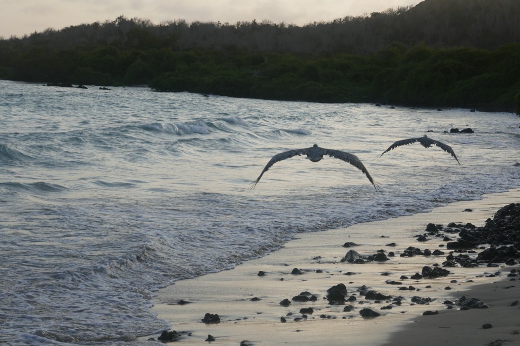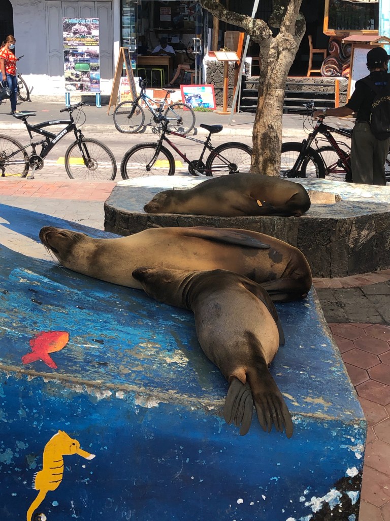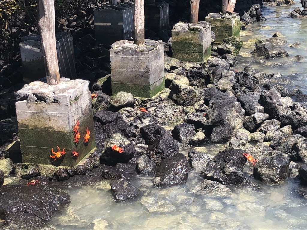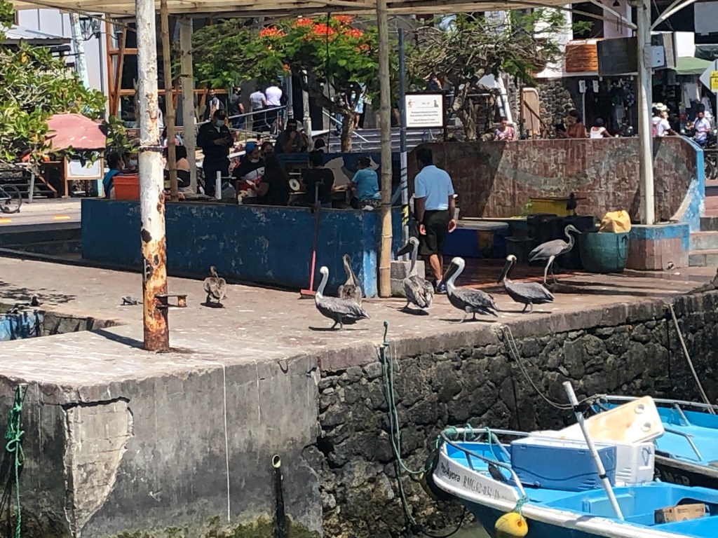Santa Cruz is het drukste eiland van de drie die we zullen bezoeken. Het schijnt dat je ook van een redelijk bruisend nachtleven kunt spreken, waar wij (opa en oma) geen weet van hebben. Er zijn talloze eettentjes langs het water waar je al je zuurverdiende geld in één keer kunt uitgeven aan geïmporteerd Amerikaans voedsel, of je loopt een paar straten verder, waar je voor een normale prijs een typische Ecuadoraanse almuerzo (lunch) kunt krijgen: soep, meestal met een onderdeel van een kip en een aardappel erin, een bord rijst met bonen en nog iets van kip of vis en een jugo natural (vers sapje). Je kunt het zo gek maken als je zelf wilt. Mijn favoriete deel van Puerto Ayora is de vismarkt. Elke dag is het er één grote chaos: de verse visvangst ligt klaar voor de verkoop en met vliegenmeppers worden de zwermende vliegen erbij weggehouden. Dat zijn echter niet de enige dieren die afkomen op de vis: zeeleeuwen (check!) liggen lui te wachten tot ze een restant toebedeeld krijgen, pelikanen (check!), meeuwen (niet check, want die hebben we in Leiden ook en zijn de vervelendste beesten ooit) en grote Pokémon/draakachtige vogels (check!) vliegen af en aan en gaan in de lucht het gevecht met elkaar aan om het stukje prooi dat ze wordt toegegooid. Overal (letterlijk, je struikelt er soms bijna over) liggen leguanen (check!), die volgens mij niet voor de vis komen, maar er toch gewoon voor de gezelligheid bij liggen of zo. En dan hebben we nog niet eens in het water gekeken! Vuurrode krabben (check!) kruipen overal tegen de kade op en verschansen zich op rotsen, nog meer zeeleeuwen liggen overal gedrapeerd of spelen in de blauwe golven en vanaf de pier kun je soms zelfs zeeschildpadden, haaien en roggen zien (niet check, want die hebben we zelf nog niet gespot). In ieder geval heel veel leven hier en dan hoef je nog niet eens echt je best te doen! Genieten!