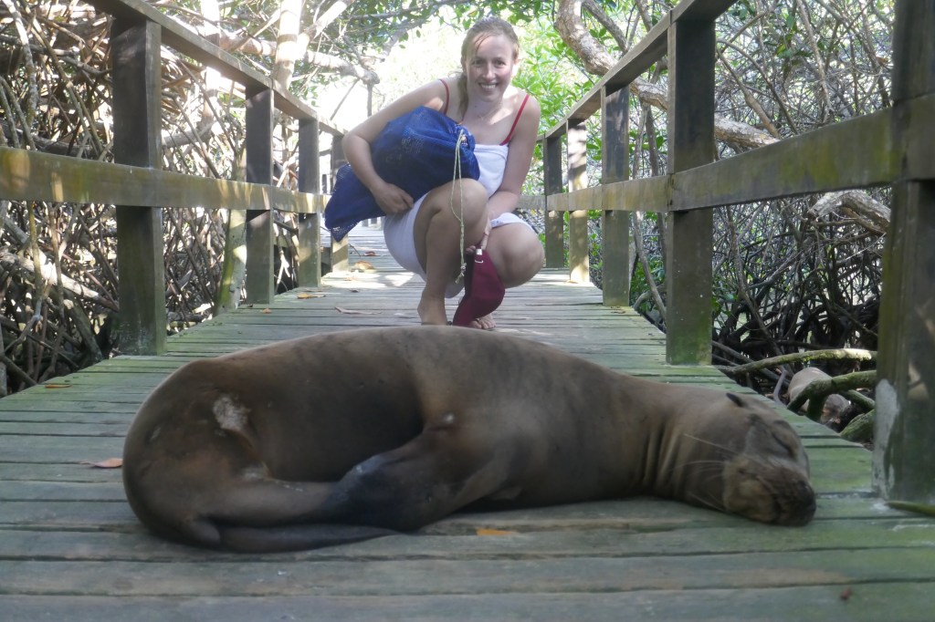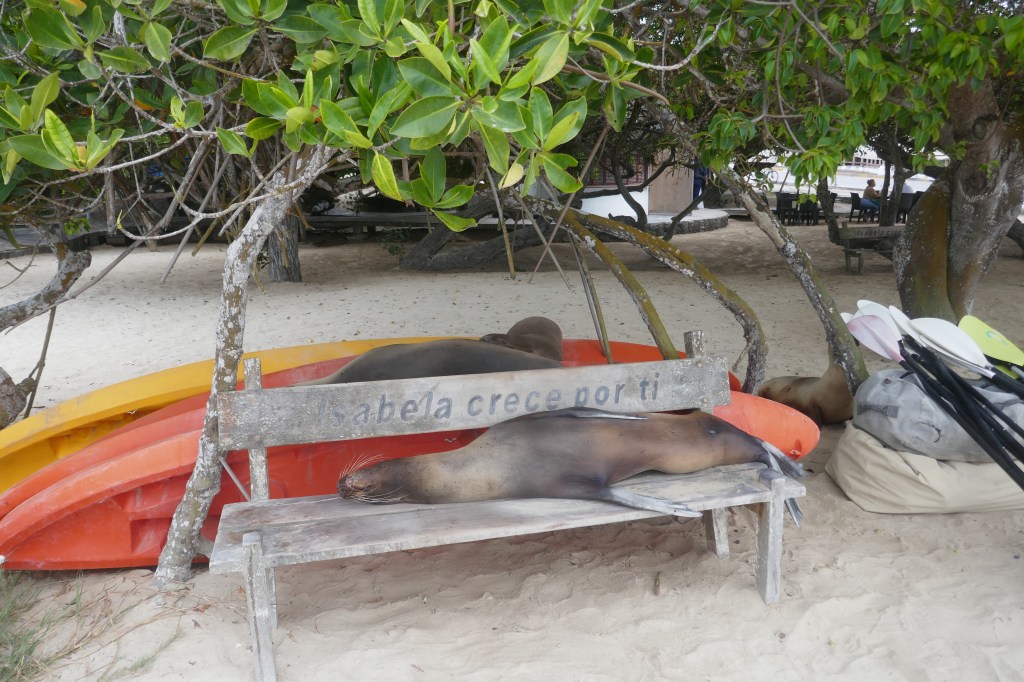 Dat smaakt naar meer! We besluiten op onze laatste dag op Isabela mee te gaan met een kayak- en snorkeltour. Opnieuw gaat het ergens mis in de organisatie en staan we om 10.30 uur tevergeefs op het strand te wachten. “Oeps, vergeten!” zegt de mevrouw bij de tour agency. Of we vanmiddag mee zouden kunnen? Gelukkig zijn wij erg flexibel (want het is een zen eiland en het is moeilijk geïrriteerd te zijn hier) en weten we nog een gratis snorkelset voor de ochtend bij haar los te peuteren. Bij onze tweede snorkelpoging bij Concha de Perla zien we allemaal megaroggen! Galapagos Rog (check!)! Ennn, we hebben het genoegen met de plaatselijke zeeleeuwen te snorkelen. Manmanman! Als je die ineens door je duikbril ziet, is het echt wel even schrikken! Ook vinden zij het vooral leuk om de snorkelaars de stuipen op het lijf te jagen en recht op je snufferd af te zwemmen, om op het laatste moment toch af te buigen. Hahaha, wat een beesten!