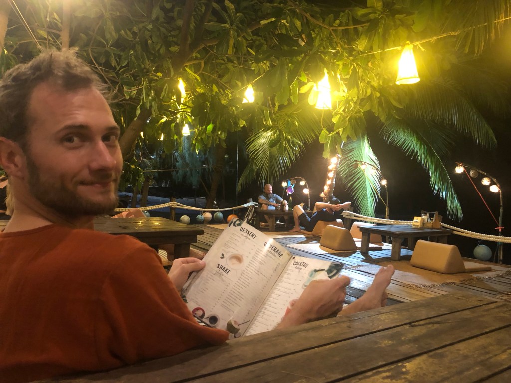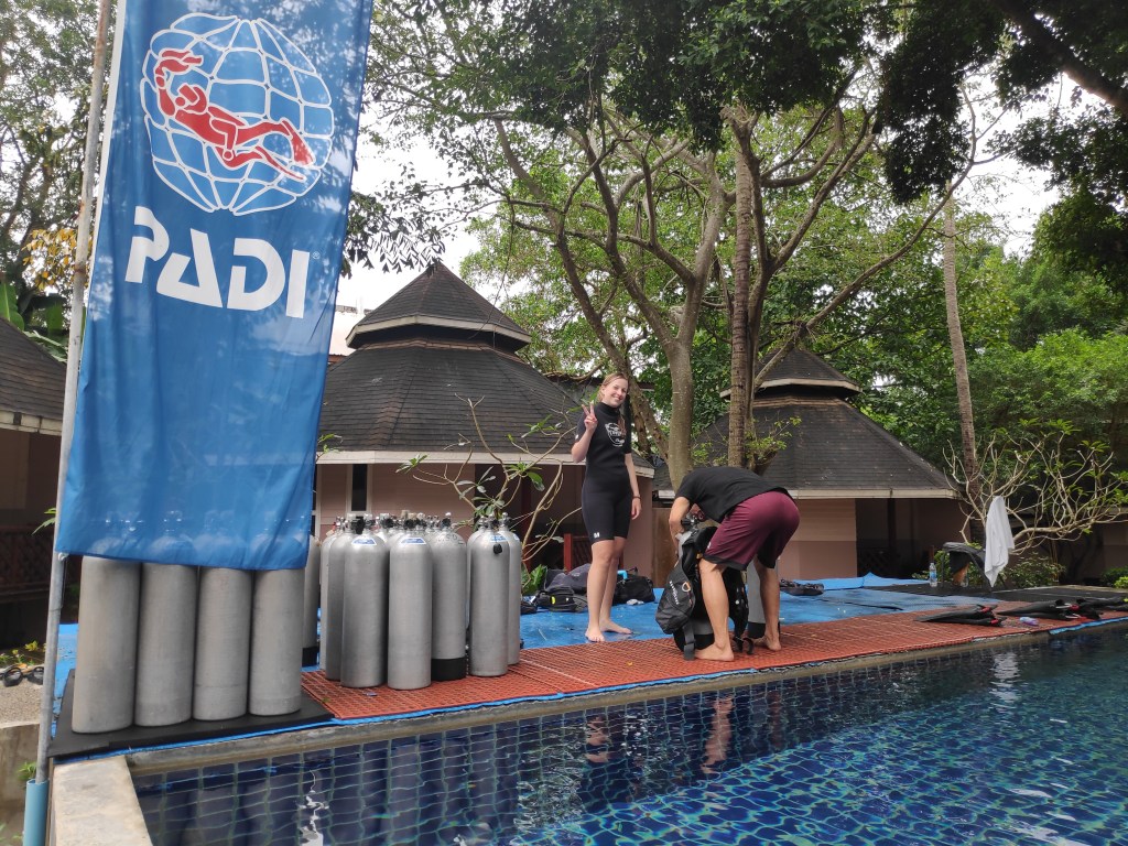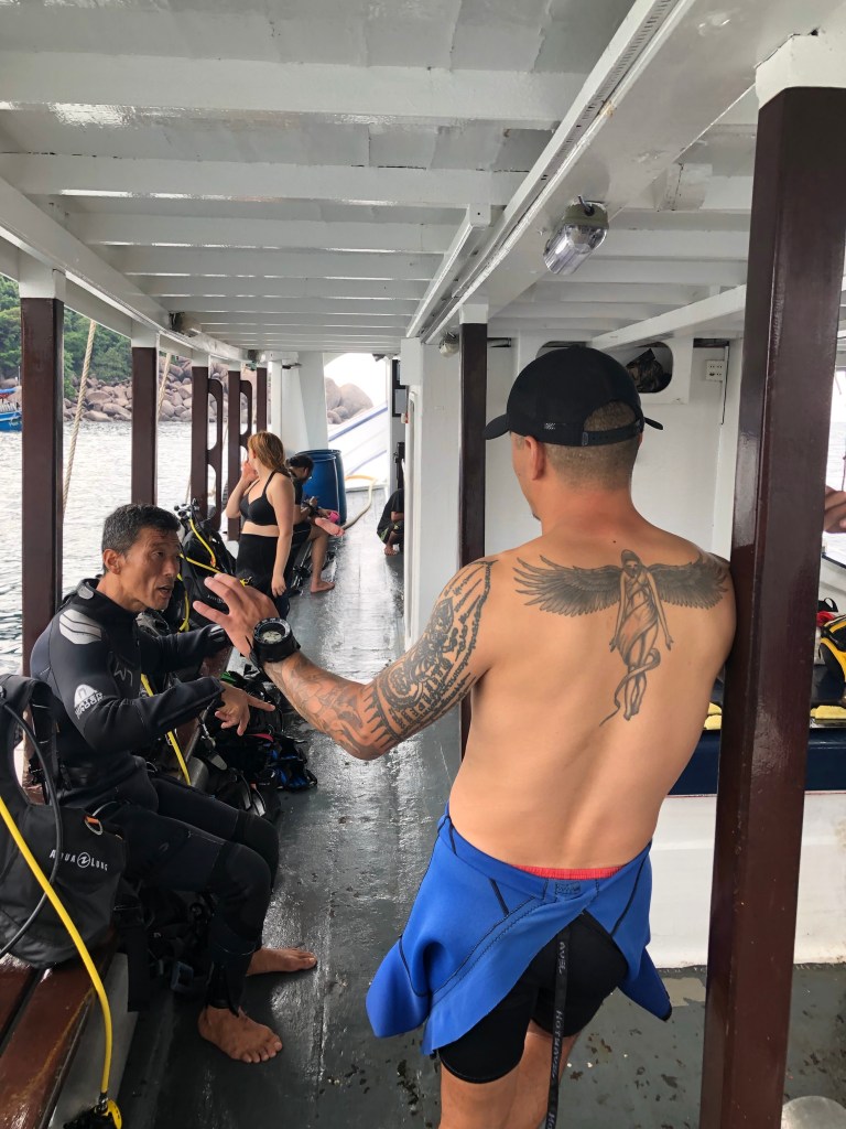 Maar, vinden we, dat mag de pret niet drukken. Het is tenslotte niet ons eerste tropische eiland van het jaar, dus laten we gewoon doen waarvoor we hier kwamen: duiken! Jazeker, ook ik ga me eens wagen aan de onderwaterwereld. Tijdens eerdere reizen heb ik het door angst en bij gebrek aan groepsdruk steeds weten te vermijden, maar met divemaster Jona als vriend (VERLOOFDE) is het toch echt tijd mijn zenuwen de baas te worden. Ook krijgen we flinke korting op het hotel als ik hier ga leren duiken, dus eigenlijk heb ik geen keuze. Die middag heb ik gelijk mijn introductiepraatje en mag ik het bijkomende papierwerk doornemen. Mijn instructeur heet Robert, een Koreaan die als kind naar de Verenigde Staten is verhuisd en nu als 57-jarige ‘ladiesman’ (niet te verwarren met ‘lady boy’) op Koh Tao vertoeft. Zo lijkt hij zichzelf in ieder geval te omschrijven. Ik ben zijn enige cursist de komende dagen, dus ik heb zowaar privéles! Wel krijg ik direct een bak huiswerk mee. HUISWERK? Niemand had me dat verteld…
