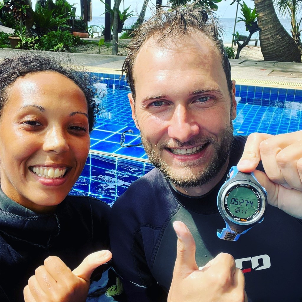 Hoera! Ik heb mijn brevet PADI Open Water binnen! Maar niet geheel onbelangrijk: ik hoef niet meer met Robert te duiken! Jona heeft zich in de tussentijd een ander principe van duiken eigen gemaakt: freediven. Waar ik amper 18 meter met zuurstof heb weten te bereiken, is hij op zijn eigen ademteug naar 20 meter diep gedoken. Met ademhalingsoefeningen en mentale voorbereidingen worden de freedivers klaargestoomd in een bijna meditatieve staat via een gespannen lijn naar de diepte te duiken. Niet alleen moet je daarbij je oren blijven klaren, maar ook houd je je adem dus minutenlang in. Zo knap! Nadat ik hem uitgebreid over mijn ervaringen heb ingelicht, waaronder een klaagzang gewijd aan Robert, vertelt hij met veel enthousiasme over zijn dagen. Hij is zo geprikkeld door deze nieuwe gewaarwording, dat hij besluit de dag erna te beginnen aan de gevorderdencursus, die vooral in het teken staat van static-apneu: in totale rust je adem inhouden in het zwembad. Hij is uiteraard een natuurtalent en bereikt de bizarre tijd van 5:27 minuten! 5:27 minuten je adem inhouden! NIET NORMAAL! Wow! Zelfs de freedive instructeurs vinden dit bijzonder en ze verwelkomen hem bij de 5-minutes club. Voor zijn step-by-step uiteenzetting verwijs ik je graag door naar www.polarsteps.com/jonathandenboer. 😉